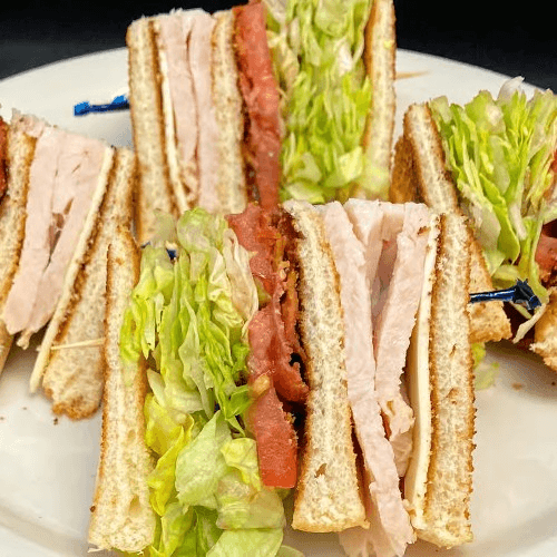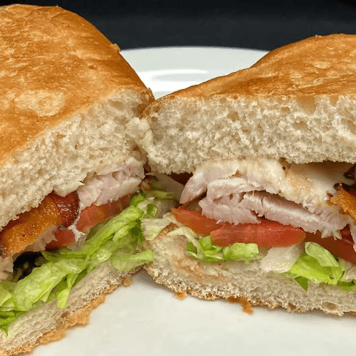 Roasted turkey breast grilled with bacon and Swiss American cheese served on a warm sub roll with mayonnaise, lettuce, onion and tomatoes