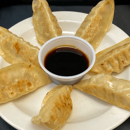 7 savory pork dumplings steamed on our flat top grill. Some call them potstickers. Some call them pork dumplings. We can all agree they are highly pleasant to eat