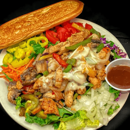 Salad includes grilled bread and shredded cheese. That's right! The hot contents of our best selling grilled chicken pita all on top of a garden salad. Includes: grilled chicken chopped and covered with sautéed onions, bell peppers, mushrooms, and melted Swiss American cheese. Amazing with our homemade ranch. Everything but the pita bread. Double the meat on salad for an additional charge