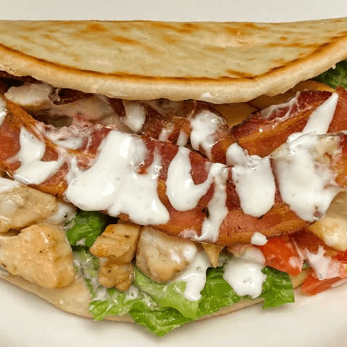Grilled teriyaki chicken, applewood smoked bacon, lettuce, tomato, swiss American and ranch on a warm pita bread. Includes 1 side