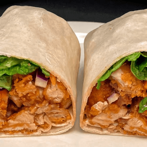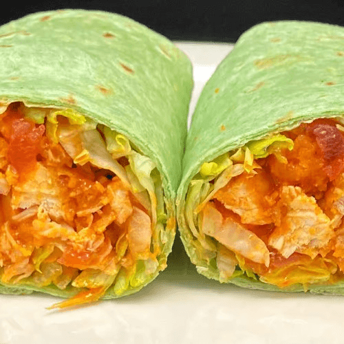 Three chicken tenders, chopped and dipped in our buffalo sauce and wrapped up in a green spinach wrap with shredded lettuce and tomato. Goes great with our buttermilk ranch dressing. Zesty! Add bleu cheese for an additional charge