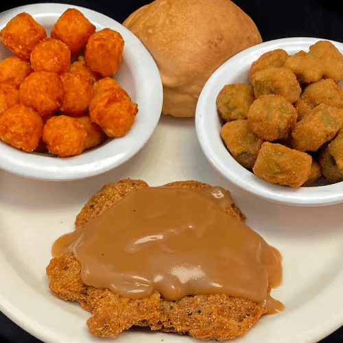 Favorite. Cubed beef steak that is battered, fried, bathed with gravy. A favorite with our regulars. It's tender enough to cut with a fork