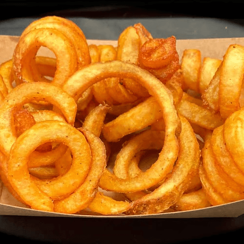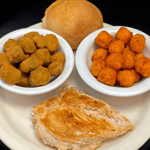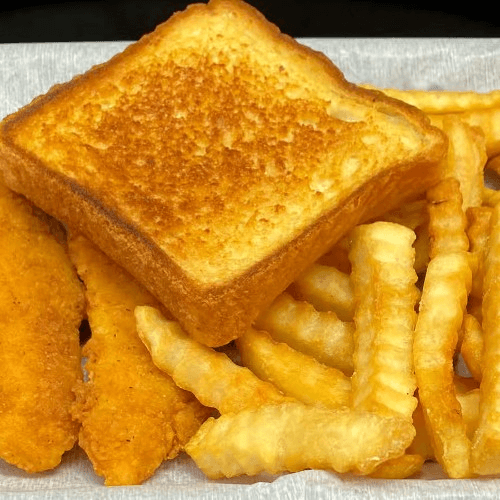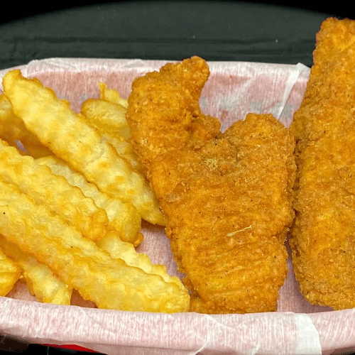 Chicken tenders. Crispy chicken tenders served with a side option, including fries, tots, or okra, and a small drink. Choice of chocolate, cookies n cream, strawberry, or vanilla kid's scoop