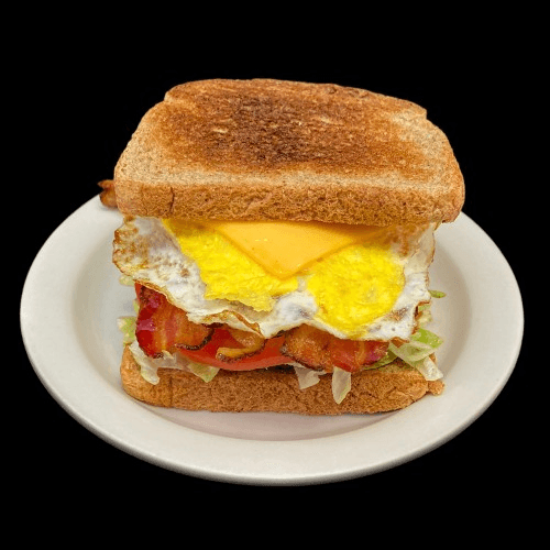 Bacon, lettuce, tomato, mayo, American cheese and 1 egg over well served on yummy toast