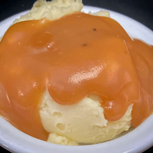 Creamy mashed potatoes topped with rich, savory gravy