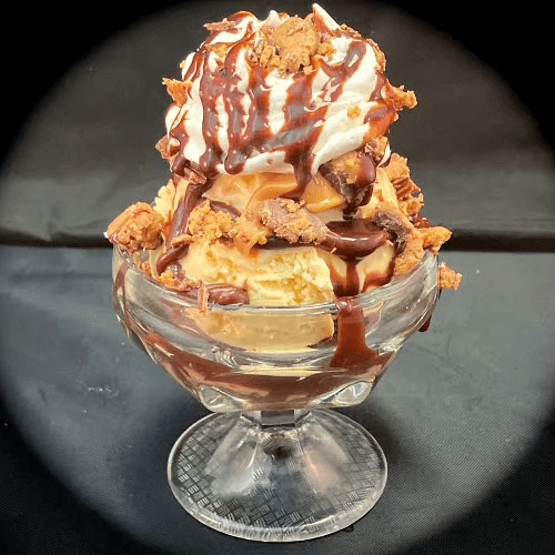 Ice cream, hot fudge, peanut butter and whipped cream topped with a Reese's peanut butter cup