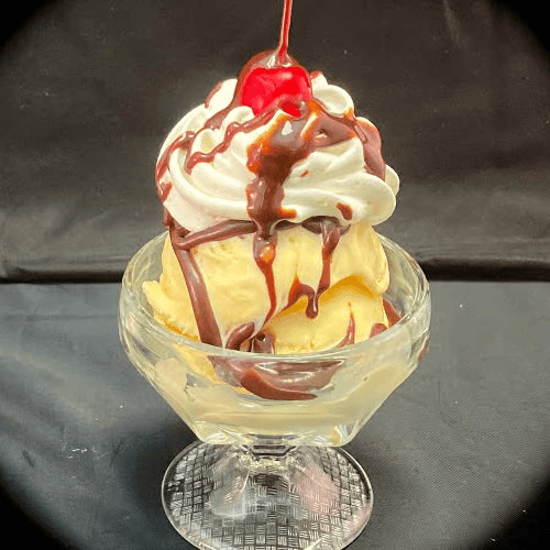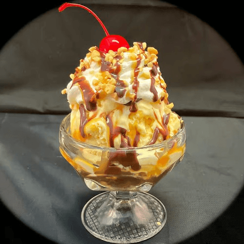 Ice cream sundae with choice of size (large, medium, small) and toppings including hot fudge, caramel, chocolate syrup, strawberry, or pineapple