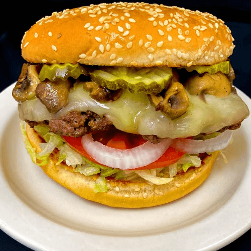 Fresh beef topped with Swiss American and a large onion ring filled with melted bleu cheese crumbles Comes with mayonnaise, lettuce, tomato, onion, ketchup, mustard and pickles
