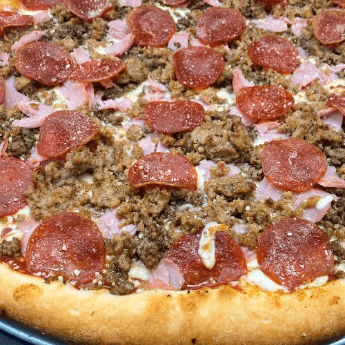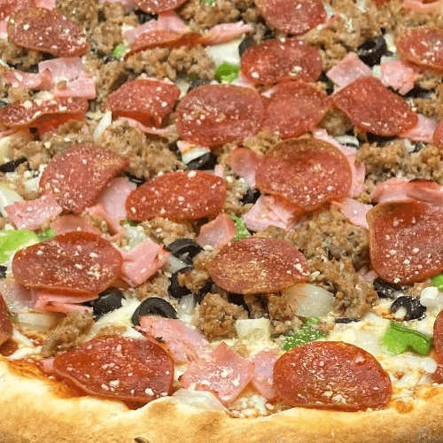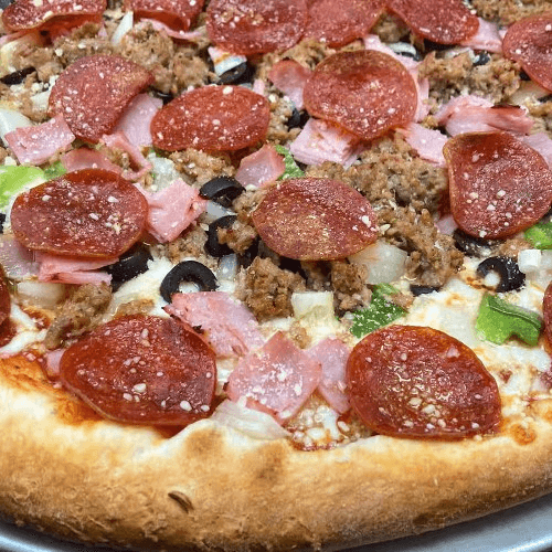Our version goes like this: pizza sauce, mozzarella cheese Italian sausage, pepperoni, ham, onions, bell pepper and black olives. No substitutions. Your Pizza already includes the toppings described above. Below are more toppings you wish to add for additional cost