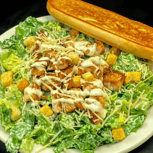 Salad includes grilled bread and shredded cheese. Marinated Grilled chicken, romaine lettuce, creamy Caesar dressing, croutons, and shredded Parmesan cheese. Double the meat on salad for an additional charge