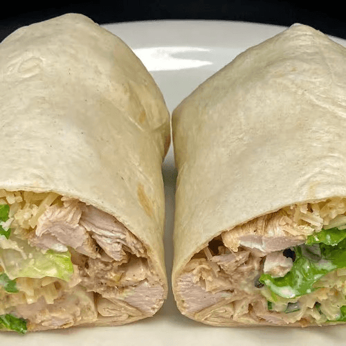 Grilled chicken, romaine lettuce, shredded Parmesan cheese and Caesar dressing rolled up in a flour tortilla. Includes 1 side