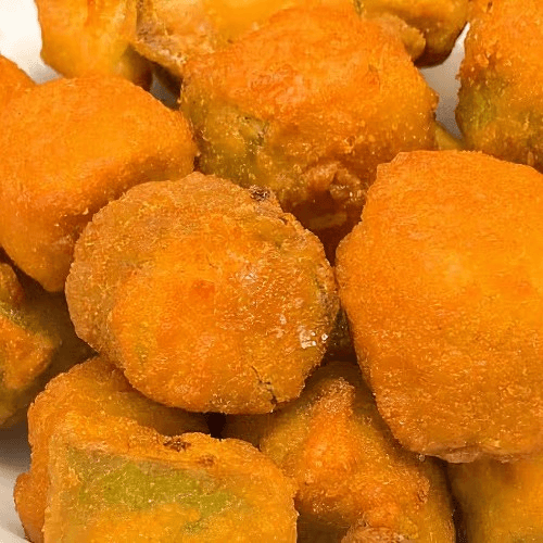 Golden-brown, crispy battered okra pieces