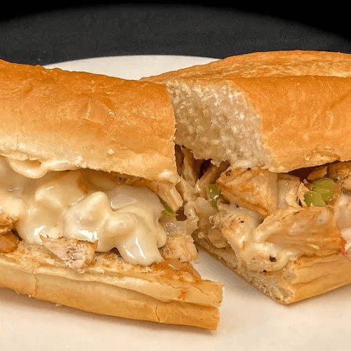 Grilled chicken breast with onions, bell peppers and topped with melted Swiss American cheese