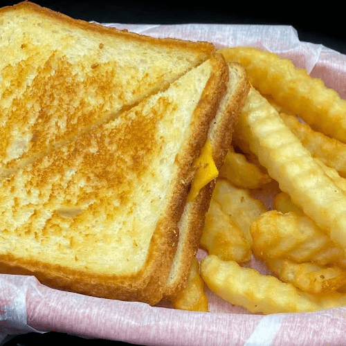 Grilled Cheese. Warm and melty, served with your choice of side like fries, tots, or onion rings. Includes a small drink and a kid's scoop of ice cream such as chocolate, strawberry, or vanilla