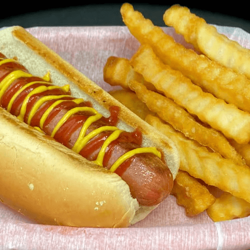 Hot dog with choice of fries, tots, potatoes, okra, or rings. Select from various drinks and ice cream flavors