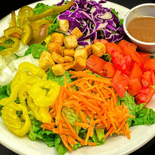 Romaine lettuce, spinach leaf, tomatoes, onions, banana peppers, shredded carrots, sweet bell peppers, purple cabbage & croutons