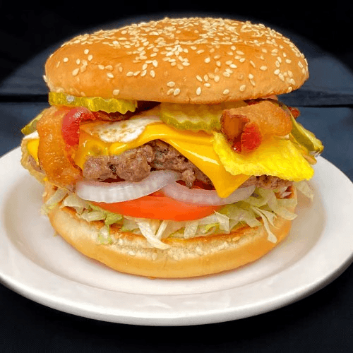 Fresh beef, American cheese, bacon and a well done fried egg. Comes with mayonnaise, lettuce, tomato, onion, ketchup, mustard and pickles