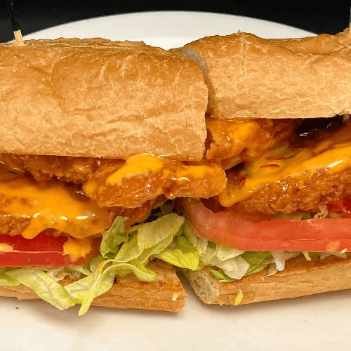 Fried chicken tenders coated in spicy boom boom sauce served on a grilled sub roll with mayonnaise, romaine lettuce & tomato. Sneaky hot!