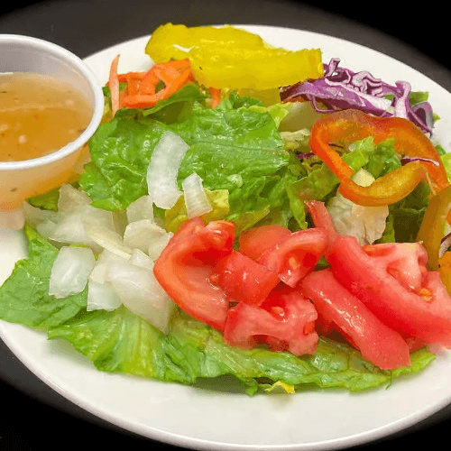 Crisp romaine lettuce with fresh tomatoes, sliced onions, bell peppers, shredded carrots, purple cabbage, and pickles, served with a light