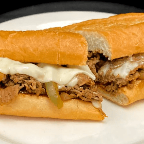 5 oz of shaved sirloin grilled with sautéed onions and bell pepper, topped with melted Swiss American cheese and steak sauce, on a warm sub roll or pita. Fantastic!