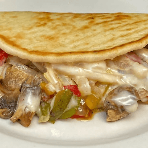 Great with our homemade ranch, sautéed red, green, and yellow bell peppers, onions & mushrooms with Swiss American cheese on a grilled pita. Includes 1 side